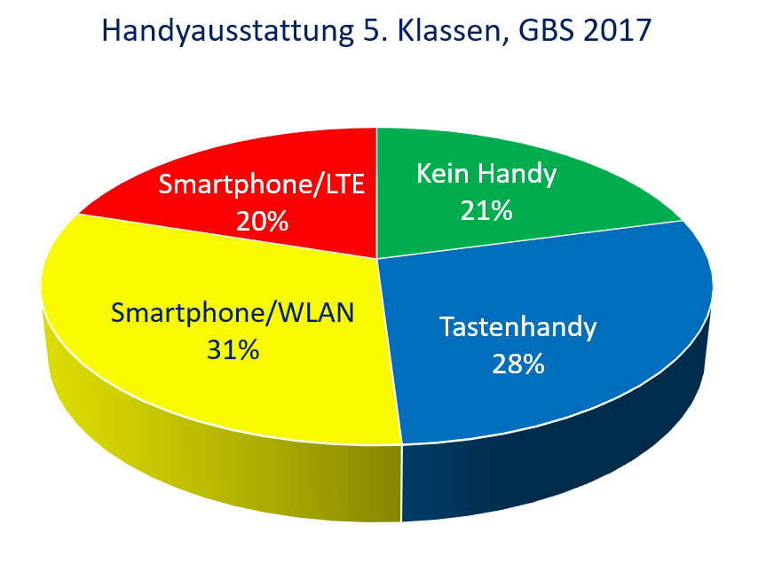 In unserer aktuellen Jahrgangsstufe 5 besitzen 21 % der Kinder gar kein Handy, 28 % ein Tastenhandy, 51 % ein Smartphone, davon 20 % mit mobilem Internet (Stand 16.08.17). Das sind immer noch deutlich zu viele Kinder mit Vollzugriff auf die digitale Erwachsenenwelt, im Vergleich zum Vorjahr bedeutet das aber einen erfreulichen Rückgang um 8 %. Deutschlandweit besitzen laut einer Bitkom-Studie vom Mai 2017 67 % der 10-11jährigen ein Smartphone, es haben also definitiv nicht „alle eins“, wie gerne behauptet wird.