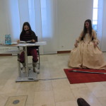 Marlene Zimmer, unser Coach von der Wiesbadener Schauspielschule, macht mit den Kindern Atem- und Entspannungsübungen, die richtige Körperhaltung für effektives Lesen wird geübt – teilweise mit einem Buch auf dem Kopf und einem in der Hand, was sich als durchaus schwierig herausstellt; die Schülerinnen und der einzige Junge, der dabei ist, werden ermutigt, an ungewöhnlichen Orten in ebenso ungewöhnlichen Körperhaltungen zu lesen, wie z.B. sitzend auf einem Baum, stehend auf der ‚Badewanne‘ (nur Insidern ein Begriff!), balancierend auf dem Abipferd, liegend auf der roten Bank vor dem Sekretariat, stehend auf einer Menschenpyramide oder zusammengequetscht in einen Schrank eingezwängt. An solchen Übungen merkt man ganz deutlich, dass Marlene Schauspielerin ist, die es gewöhnt ist, in allen auch noch so komischen Lebenslagen zu sprechen und zu agieren – und diese Fähigkeit möchte sie den Kursteilnehmern vermitteln. Letztlich geht es dabei um die Ausbildung eines besseren Körpergefühls, aber auch um Mut und Selbstvertrauen.