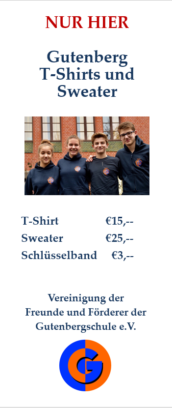 Der Förderverein verkauft ab sofort jeden ersten Donnerstag im Monat von 13:00 bis 13:45 Uhr Schul-T-Shirts und Sweatshirts im Werkraum im Keller.