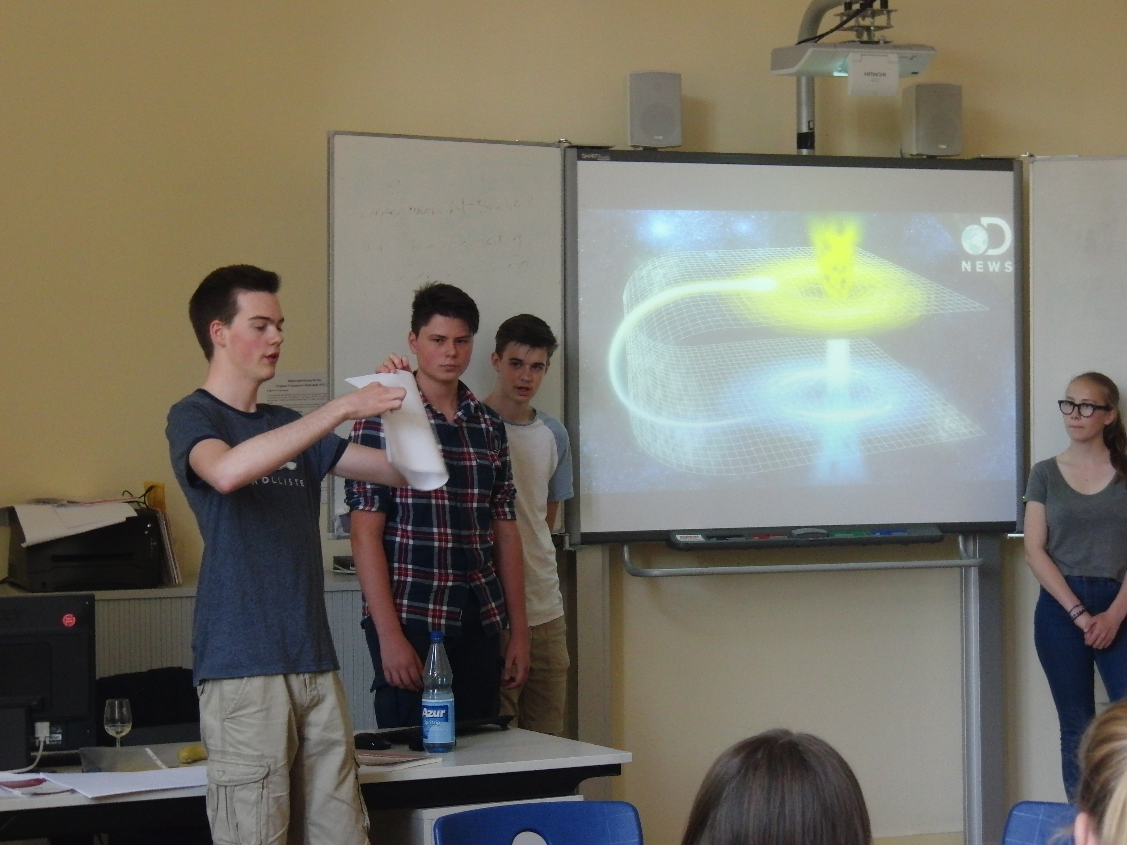 Dieses Coaching war dem Wettbewerbserfolg von Marten Karl, William Koch und Lucas Schorling (alle Q2) beim MINT-EC SchoolSlam 2016/17 zu verdanken. Ihr Beitrag zur speziellen Relativitätsheorie wurde am 24.02.2017 in Berlin ausgezeichnet (zum Bericht).