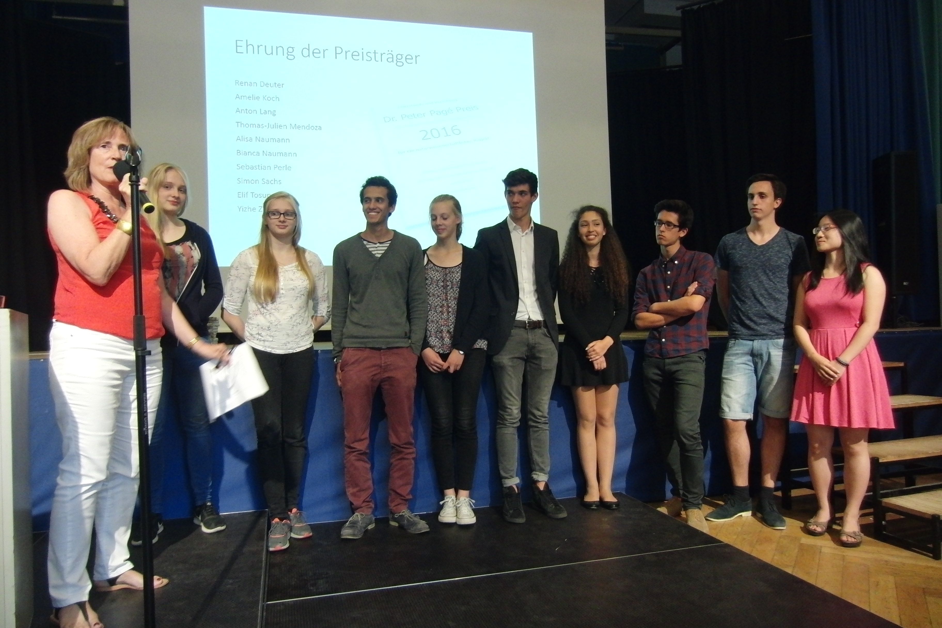 (13.07.2016) Heute wurde der Pagé-Preis erstmals im Rahmen einer Feierstunde in der Aula der Gutenbergschule verliehen. Eingeladen waren neben den Wettbewerbsteilnehmern, deren Angehörige sowie Schüler, Lehrer, Eltern und Ehemalige (Schüler, Lehrer, Eltern). Etwa 100 Personen folgten der Einladung, unter Ihnen auch der Schullleiter Herr Dr. Buchwaldt.