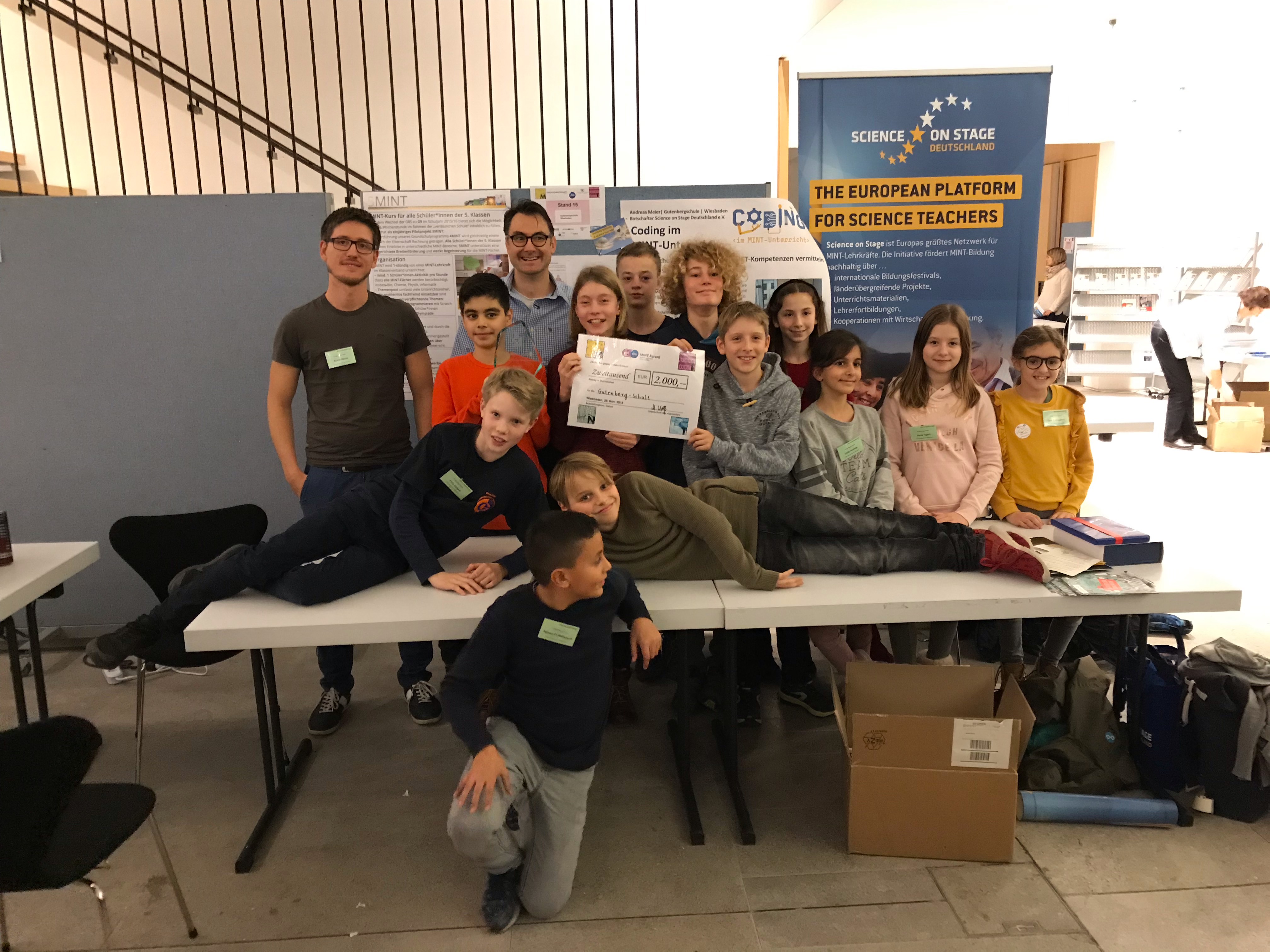 In diesem Jahr waren wieder mehr als 20 hochkarätige MINT-Projekte vertreten, am Ende überzeugte das Projekt 5MINT der Gutenbergschule die Jury. Diese zeichneten es mit dem 2. Platz und einem damit verbundenen Preisgeld in Höhe von 2000 € aus. Einen besonderen Eindruck auf die Jury machte die große Zahl von Schülerinnen der Klassen 5a, 6s, 7e die das Projekt gekonnt vor über 200 Personen in einer 5-minütigen Präsentation erläuterten. Unterstützt wurden sie von Schülerinnen und Schülern der Q1, die gemeinsam mit weiteren Schülerinnen und Schülern aus den Klassen 5a, 6s, 7e den Messestand betreuten. Hier konnten die Messe-Besucher 5MINT dann live erleben: Programmieren mit Scratch und der von Förderverein gesponserte Elektrokasten wurden von den Schülerinnen und Schülern aktiv und überzeugend präsentiert.