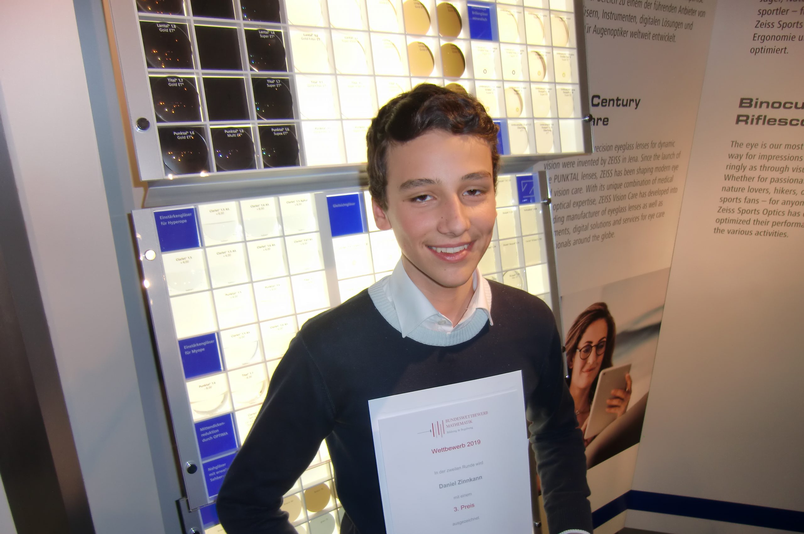 In diesem Jahr erreichte er in der 2. Runde einen 3. Preis, heute wurde er daher mit den anderen Preisträgern aus Brandenburg, Hessen, Sachsen-Anhalt und Thüringen zur Preisverleihung nach Jena zur Carl Zeiss AG eingeladen. Dort nahm er die Auszeichnung im Beisein seines Vaters und seines Mathematiklehrers Andreas Meier entgegen. Herzlichen Glückwunsch.