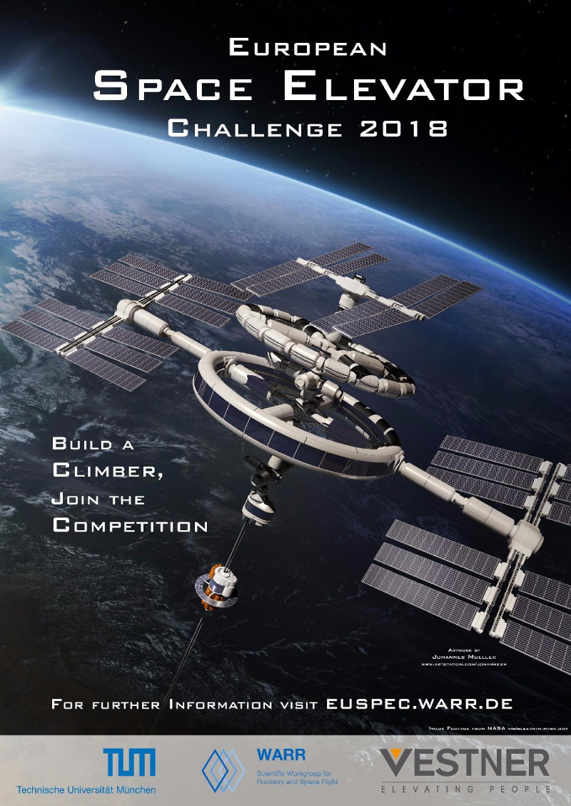 Die European Space Elevator Challenge 2018 findet vom 17. bis zum 20. September am Campus Garching der Technischen Universität München (TUM) statt – Climber können auf einer 100 m Fahrstrecke gegeneinander antreten. Es gibt außerdem eine eigene Kategorie für Schülerteams und Einsteiger.