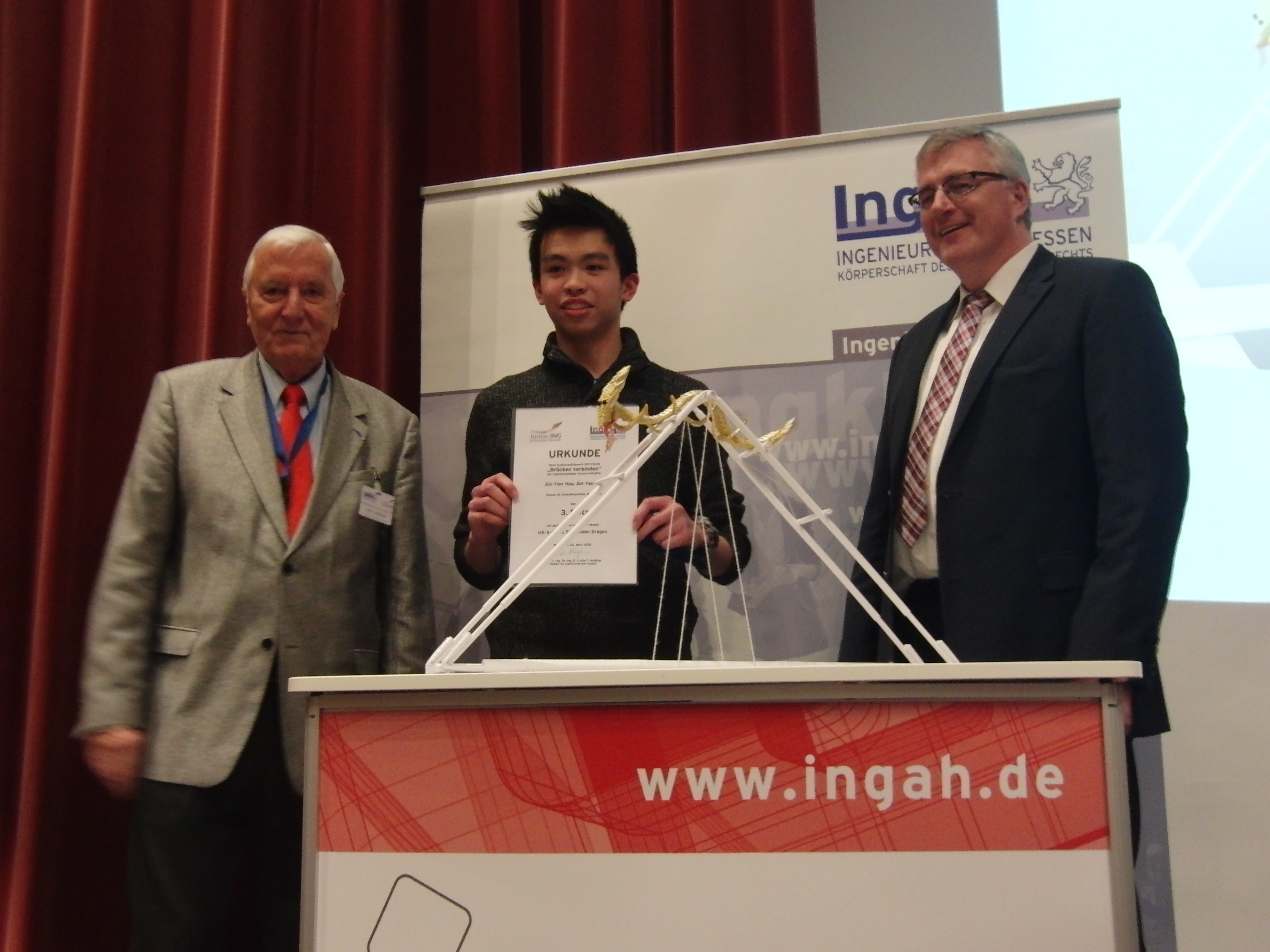 9 Gruppen der Gutenbergschule (8 x MINT-Klasse, 1 x WU8 Nawi) reichten schließlich ihre Modelle bei der IngKH ein. Bei der heutigen Preisverleihung in Gießen staunte die anwesende MINT-Klasse dann nicht schlecht, als die Modertoren das Modell „Golden Dragon“ mit dem 3. Platz auszeichneten. Unter lautem Jubel seiner Mitschülerinnen und Mitschüler nahm Sin-Yien Hau die Ehrung entgegen. Die Brücke hatte er gemeinsam mit seiner Schwester Sin-Yau (Klasse 7) konstruiert. Beide freuen sich über ein Preisgeld in Höhe von 100 €. Herzlichen Glückwunsch!