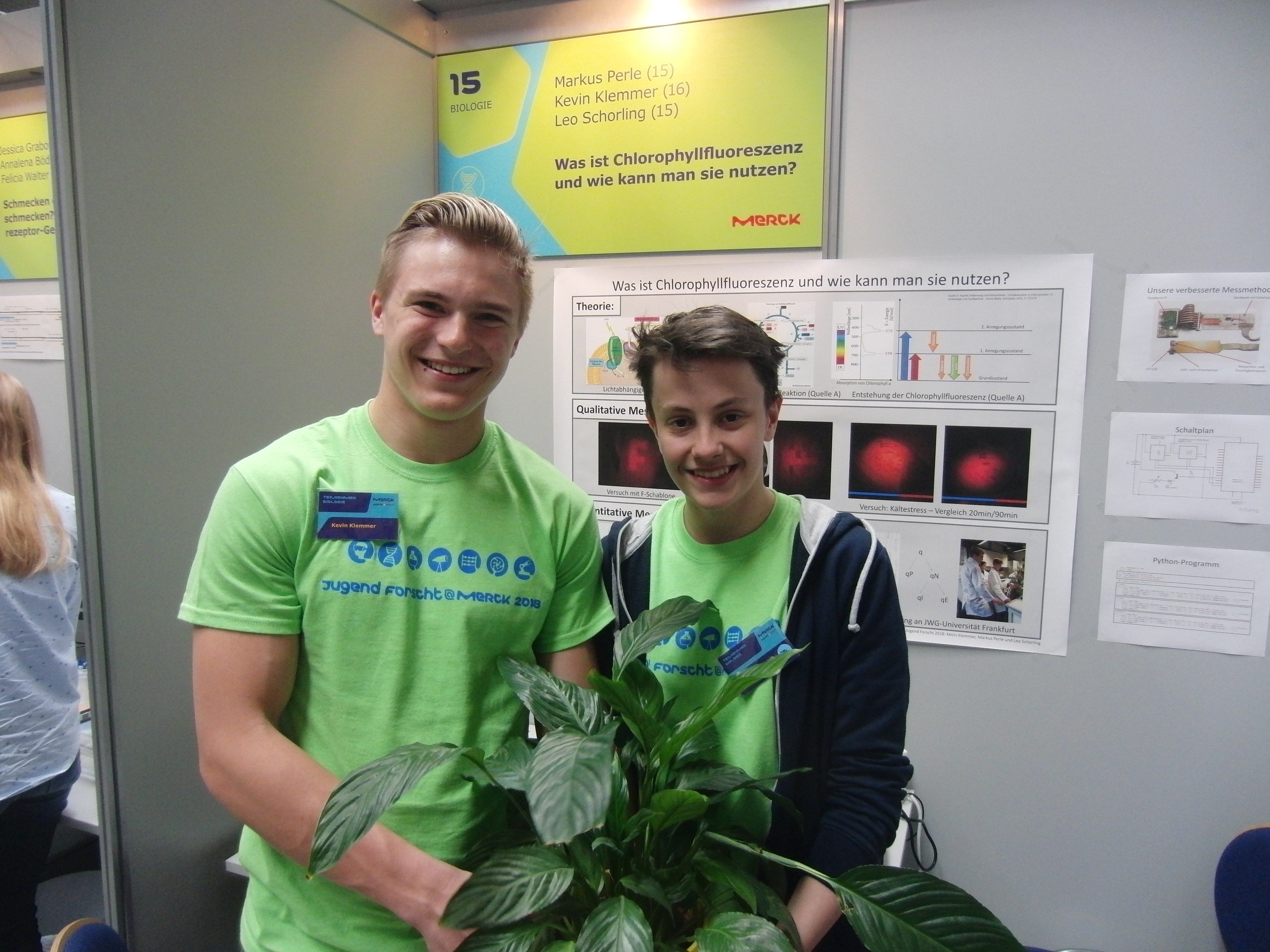 (Darmstadt/Wiesbaden 10.04.2018) Markus Perle und Kevin Klemmer präsentierten gestern und heute ihr erfolgreiches Jugend forscht Projekt beim Landeswettbewerb in der MERCK-Sporthalle in Darmstadt. Gemeinsam mit Leo Schorling forschten sie zum Thema Chlorophyllflureszenz und untersuchten Nutzungsmöglichkeiten dieses Effekts.