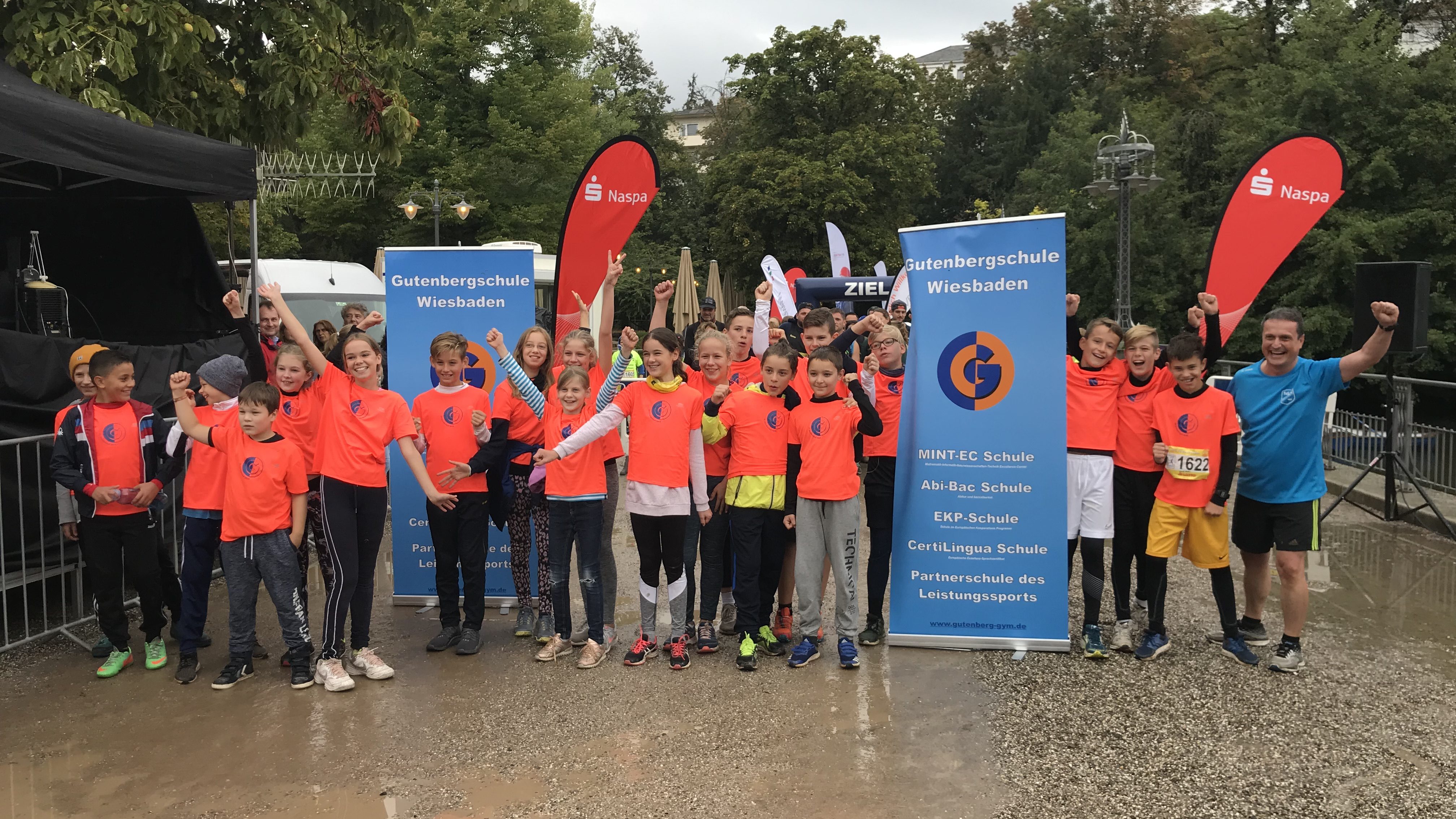 Wie in jedem Jahr nahmen auch diesmal wieder viele Gutenbergler am Frankfurt-Marathon am letzten Oktober-Sonntag teil. Die Vorbereitung lag in den Händen des Lehrer-Trainers Diedrich Meyn, der dabei wieder vom Elternvertreter Klaus Doesseler unterstützt wurde. Die Abläufe mit Anreise vom Wiesbadener Hauptbahnhof aus, Eintreffen auf dem Platz hinter der Festhalle, Vorbereitungen auf den Lauf und dem Start an der Ludwig-Erhard-Anlage sind mittlerweile so eingeübt und routiniert, dass Lehrer, Eltern und Kinder sich in aller Ruhe auf ihren Start vorbereiten konnten und den Lauf durch Frankfurts Straßen einfach nur genießen konnten. Vorbei ging es dann an Tausenden von Zuschauern entlang der Strecke, an der auch Musikgruppen zu der guten Stimmung beitrugen. Der Höhepunkt war dann wie immer der Zieleinlauf in die Frankfurter Festhalle über den roten Teppich, der bei Musik, Moderation und Lichteffekten zu einem ganz besonderen Erlebnis wurde. Hinter dem Ziel wurden alle Läufer mit einer aufwendig gestalteten, massiven Medaille ausgezeichnet, welche das Bild zeigt.
