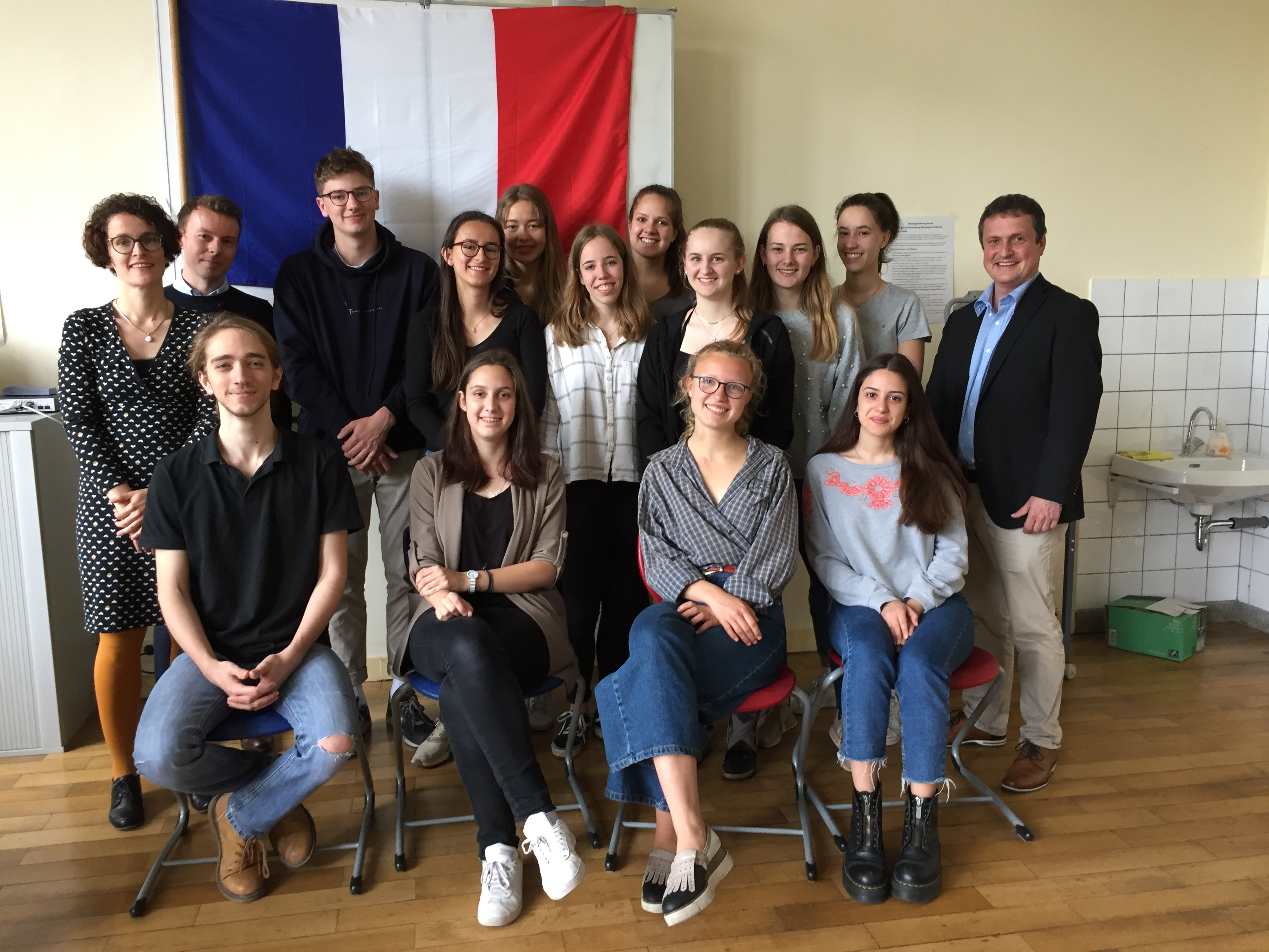 Die Notenbekanntgabe nach den Prüfungen erfolgte im CDI im Beisein von Herrn Dr. Buchwaldt, dem französischen Prüfungsbeauftragten Herrn Bouchoucha, der Leistungskurslehrerin Frau Ott sowie der Fachbereichsleiterin Frau Termer. Die feierliche Übergabe der französischen Zeugnisse erfolgte dann im festlichen Rahmen der Akademischen Feier in der Lutherkirche am 17. Juni 2018.
