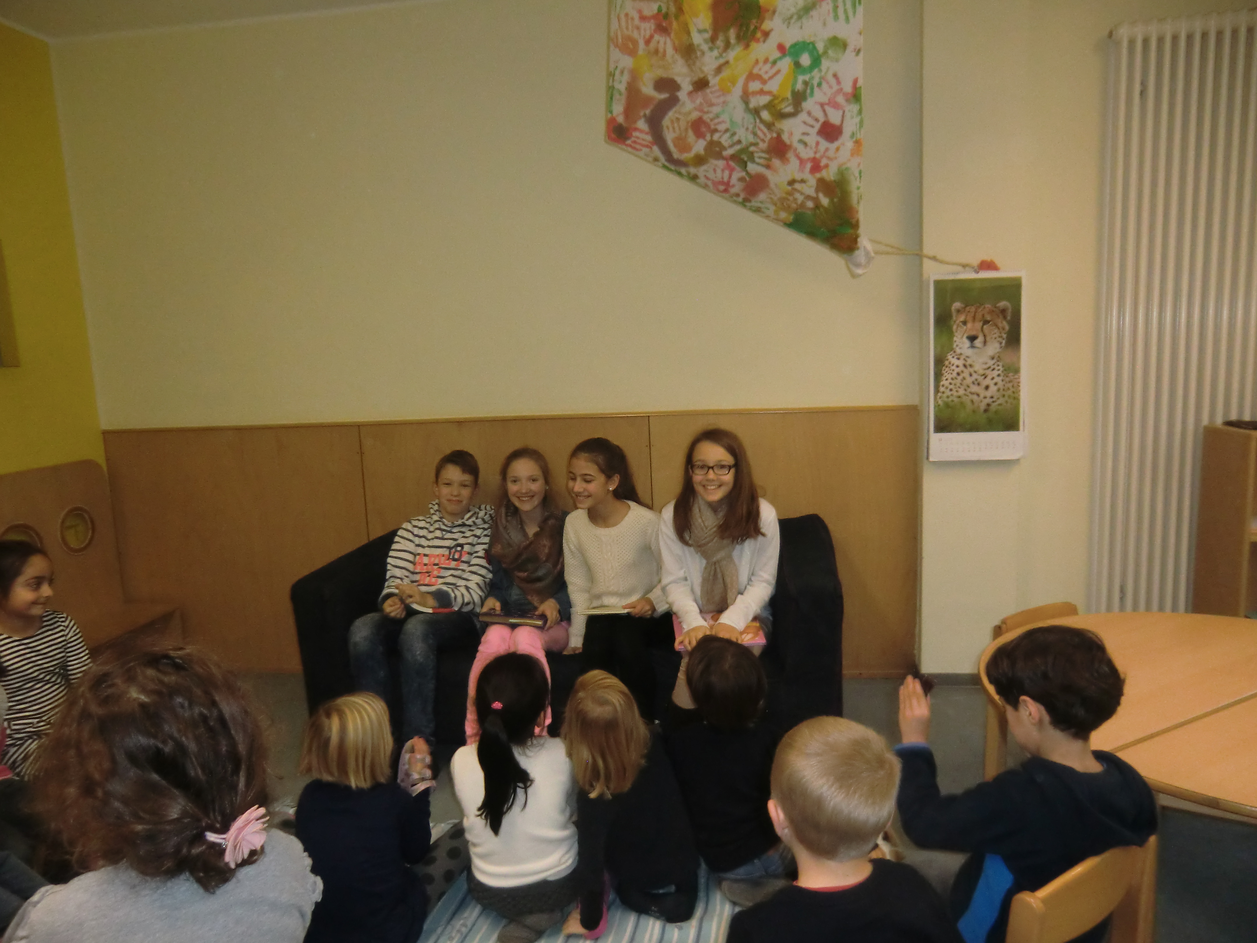 Mina, Kaya, Eline und Karl präsentierten mit großem Talent und Einfühlungsvermögen ihre Texte und beantworteten geduldig die Fragen der kleinen Zuhörer.