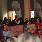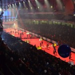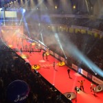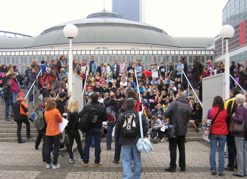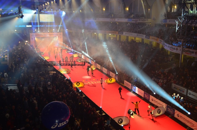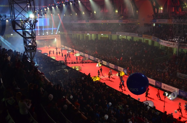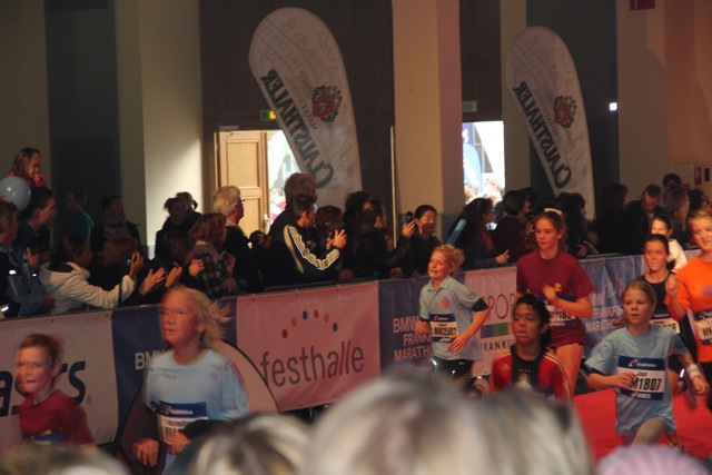 es zum Start, auf die Friedrich-Ebert-Anlage vor der Messehalle. Der Rundkurs führte an zahlreichen Zuschauern vorbei durch die Hochhausschluchten der Frankfurter Innenstadt, vorbei an der Alten Oper und endete in der Festhalle, in der die Schüler nicht nur von den mitgereisten Eltern, sondern auch von einem begeisternd applaudierenden Publikum angefeuert wurden, das die Festhalle in Erwartung der ersten Profiläufer bereits bis zum letzten Platz gefüllt hatte.